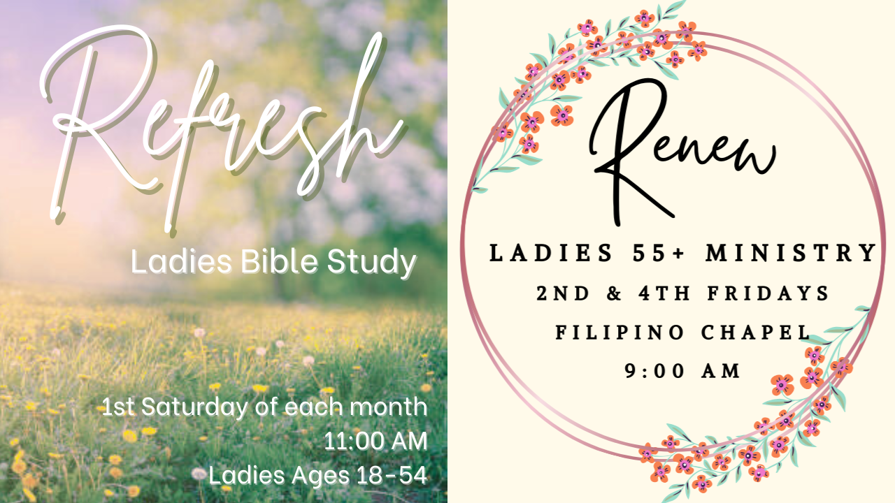The Renew ladies ministry provides a community for women age 55+, while the Refresh ladies ministry is for ladies 18-54. Both groups are focused on empowering ladies to pray and serve while also encouraging each other through Godly fellowship. Renew meets the 2nd and 4th Fridays of the month, while Refresh meets on the first Saturday of each month.